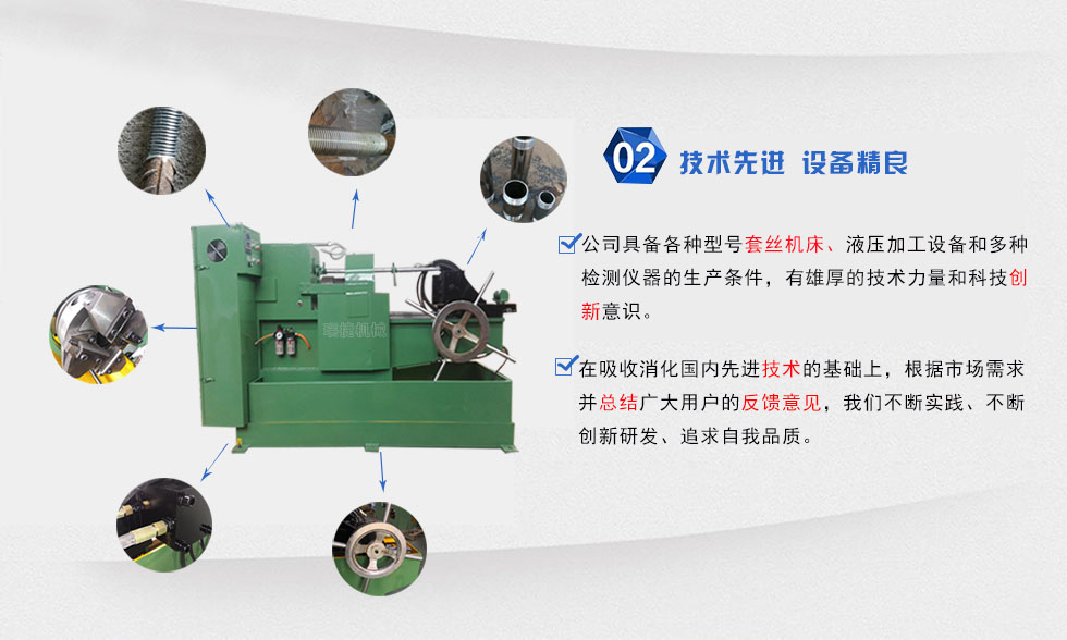 本套絲設(shè)備屬于無削加工設(shè)備,運(yùn)用特殊的切削技術(shù),上絲輕盈快捷,提高生產(chǎn)效率,采用三點(diǎn)一線,同心度高,性能穩(wěn)定等優(yōu)點(diǎn),本機(jī)每分鐘可切削3-5根工件,速度快,效率高,對于一些不定長度的鋼結(jié)構(gòu)公司,橋梁工程,電力設(shè)施等大企業(yè)的批量生產(chǎn)之需要。